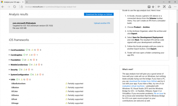 本質(zhì)上這項(xiàng)工具就是先對(duì)應(yīng)用進(jìn)行審查,并反饋回Windows Bridge for iOS所支持框架和類的信息。這個(gè)結(jié)果能夠讓開發(fā)者清楚的知道使用bridge來移植應(yīng)用還需要做那些方面的調(diào)整,從而可以預(yù)估工作量和時(shí)間。