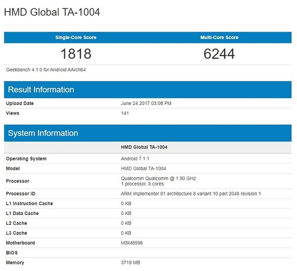 Geekbench上曾出現(xiàn)過名為HMD Global TA-1004設備的跑分,這是HDM暫未發(fā)布的產品,配備了高通驍龍835處理器,很多人猜測這就是HMD即將發(fā)布的旗艦Nokia 9,但是最新的消息顯示這款TA-1004其實是Nokia 8,并不是最頂級的Nokia 9,并且Nokia 8有可能就在這個月31號在歐洲發(fā)布。
