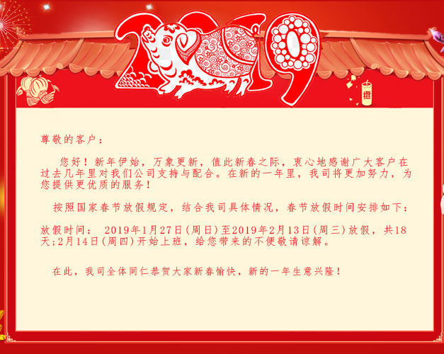 放假時(shí)間: 2019年1月27日(周日)至2019年2月13日(周三)放假,共18天;2月14日(周四)開始上班,給您帶來的不便敬請(qǐng)諒解。