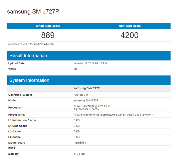 而今天,三星 Galaxy J7 (2017) 的配置也出現(xiàn)在了 Geekbench 的數(shù)據(jù)庫(kù)中,其搭載的是代號(hào)為 msm8953 的高通驍龍 626 處理器,主頻 2.21 GHz 為搭配 2GB RAM + 16GB ROM。跑分成績(jī)?yōu)閱魏?889;多核則為 4200。這一成績(jī)還高于聯(lián)發(fā)科今年將主打的中端新品 Helio P20 。