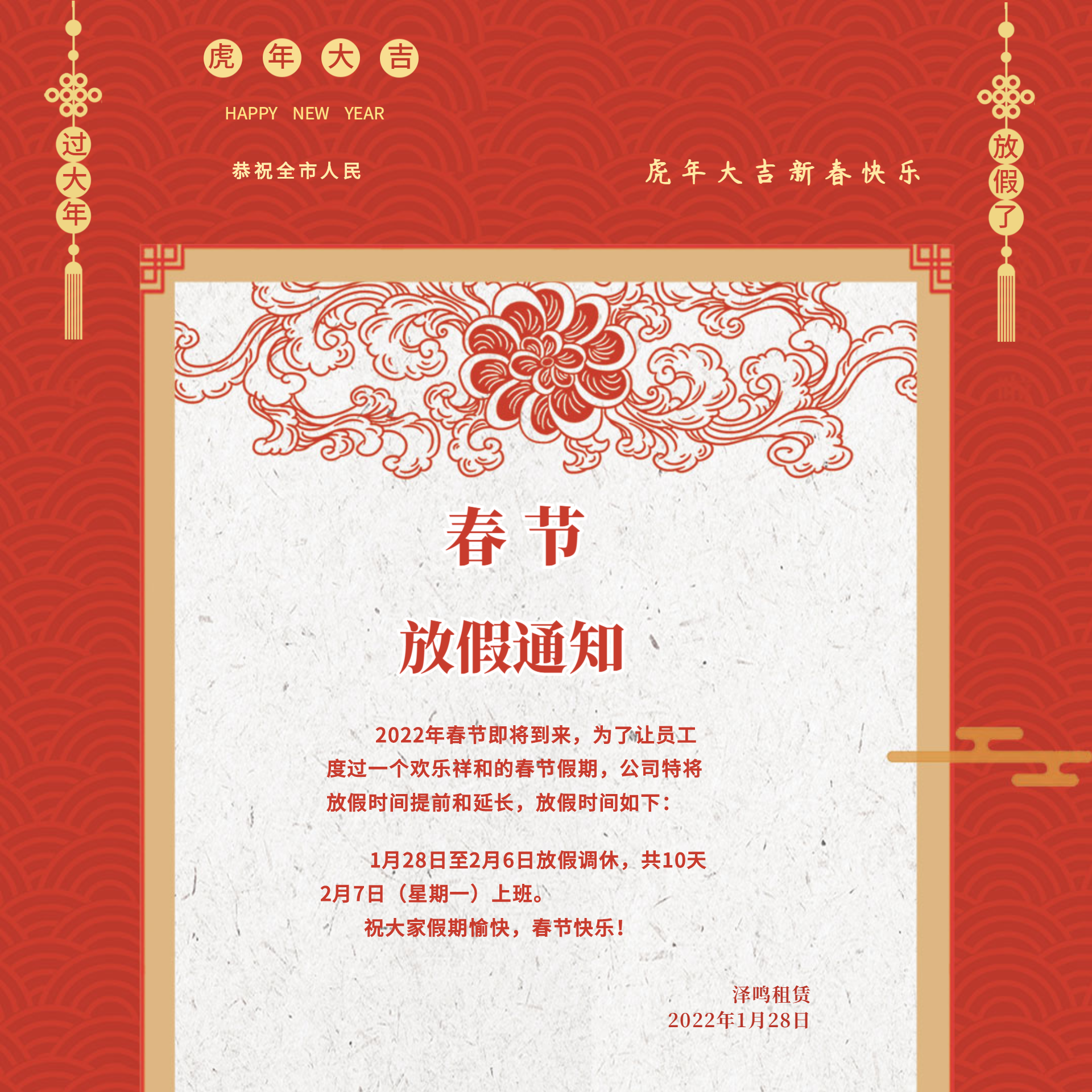 1月28日至2月6日放假調(diào)休,共10天2月7日(星期一)上班。