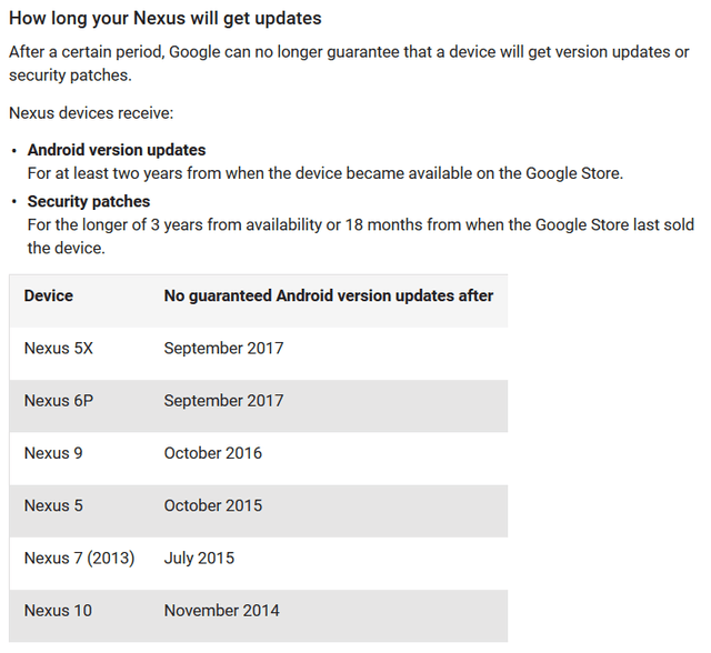 當(dāng)然停止接收系統(tǒng)更新并不等于停止接收安全補(bǔ)丁。根據(jù)該表格文字所述,Nexus設(shè)備在上架3年內(nèi)、或Google Store停售后18個(gè)月內(nèi)都將持續(xù)獲得安全補(bǔ)丁更新。舉例來(lái)說(shuō),Nexus 9于今年4月停售,因此直至18個(gè)月后——也就是2017年10月——Nexus 9都將能夠獲得安全補(bǔ)丁的更新。