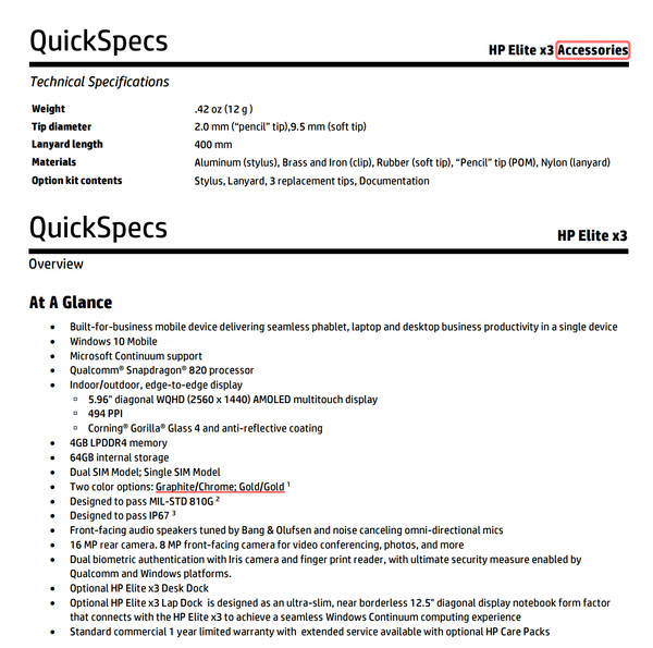 惠普Elite X3規(guī)格公布 帶手寫筆的小電腦